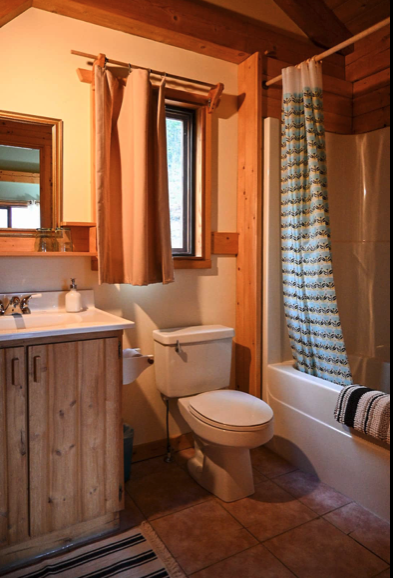The cozy cabin has a queen bed in the bedroom. Full bathroom is ensuite.